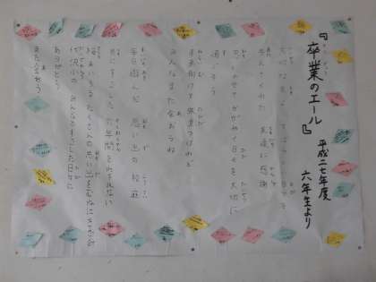 3月2日(水)に行いました「6年生を送る会」。その会の終わりに、6年生から在校生へ贈られた歌『卒業のエール』の歌詞が、東側昇降口の掲示板に掲示されました。