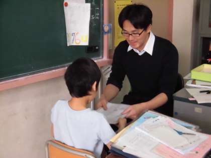 下の写真は、3月24日(木)の修了式の後、4年2組、5年1組、5年2組の教室で、通知表「わかば」を手渡している様子です。
