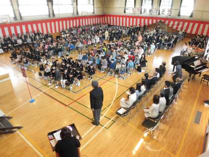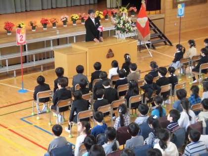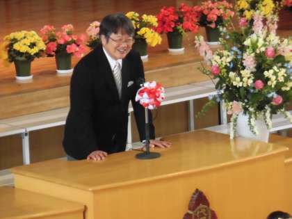 入学式は「1.はじめの言葉」「2.国歌斉唱」「3.学校長の話」と続きました。