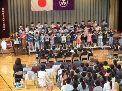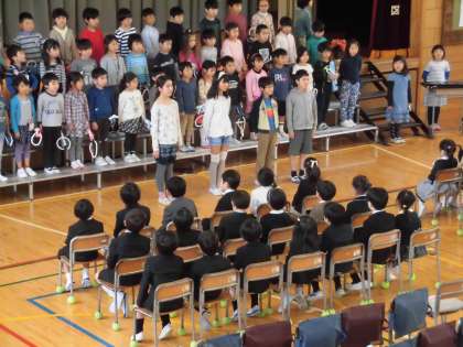次は、入学式「6.歓迎の言葉」です。6年生代表委員および2年生が中心となって、1年生におくられました。