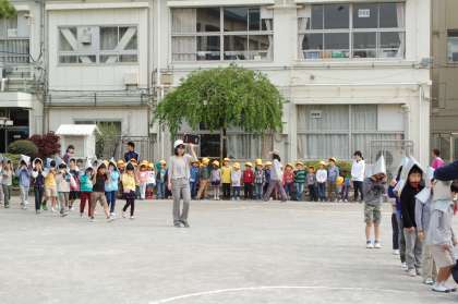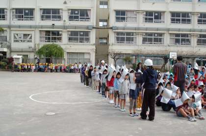 1年生のみんなは先に校庭に出て、避難訓練の様子を見学しました。