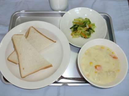 ジャムサンド 牛乳 コーンシチュー アスパラガスのサラダ