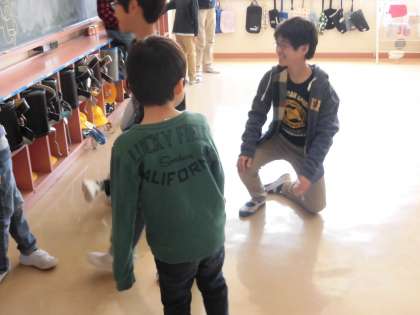 6年生は今、1年生が学校に慣れるまでの期間、1年生の各学級に遊びに来てお世話をしてくれています。何やら折り紙をしているグループがあれば、お兄さんに抱きついて喜んでいる子もいました。「今から読み聞かせをします。後ろに来てください。」と呼びかけるグループもありました。