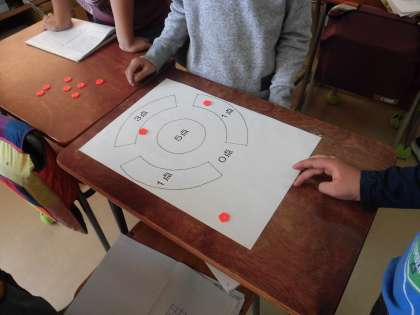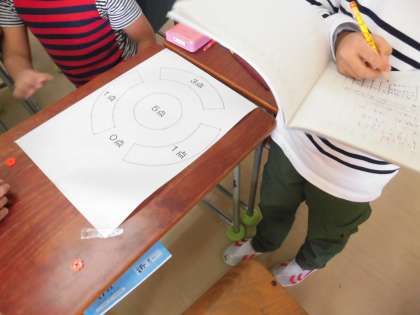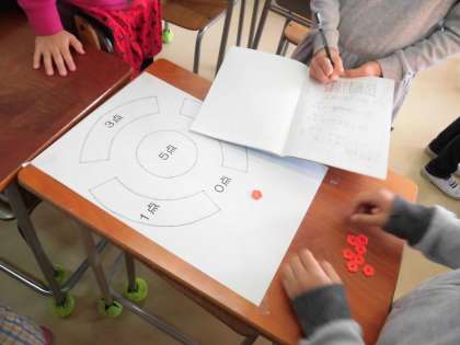 3年生は今日、算数科の授業「かけ算」で『0のかけ算』の学習をしました。学習のねらいは「合計点を乗法で計算しながら、楽しく点取りゲームをする」です。