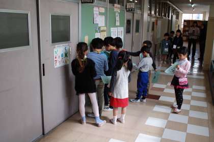 校舎内のいろいろな教室の前に、案内カードとシールが置かれています。2年生は、その前でその教室の説明をし、シールを1年生の探検カードに貼ってあげます。