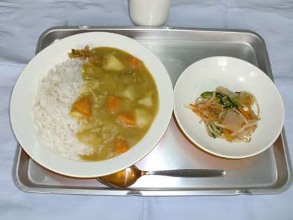 チキンカレーライス 牛乳 福神漬 こんにゃくサラダ