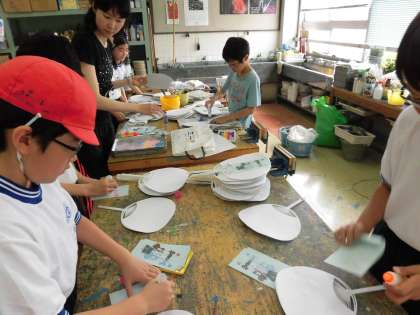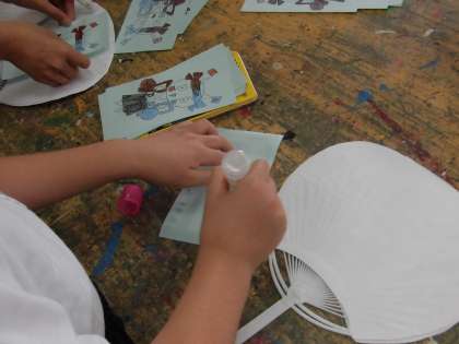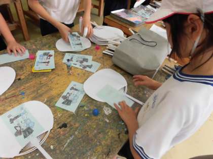 各ご家庭から要らなくなったうちわを募りました。そして白い紙を貼り、そしてそこに代沢小学校のマスコットのイラストをのりで貼り付けていきました。