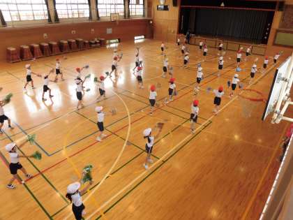 5月24日(火)の2時間目、1年生は「校舎お別れ『運動会』」の練習を、涼しい体育館で行いました。