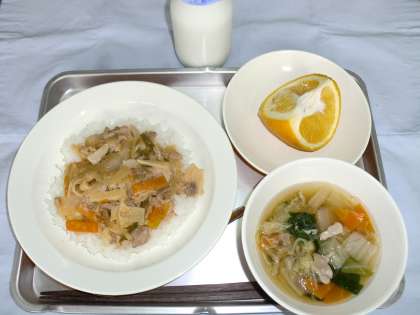 スタミナ丼 牛乳 白菜スープ くだもの