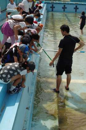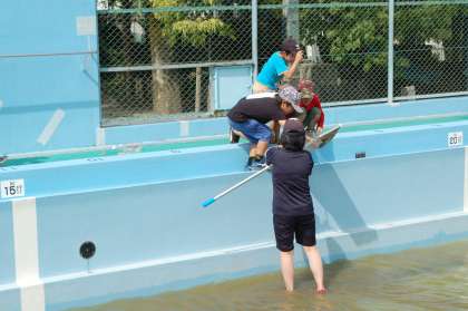 本日、3年生はプールの清掃が入る前に、廣島先生と一緒にヤゴとりをしました。