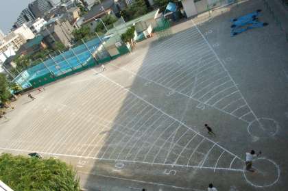 明日、代沢小学校では「新体力テスト」の『ソフトボール投げ』を全校で実施します。その準備として今日の6月8日(水)の放課後、職員一同で『ソフトボール投げ』の会場のライン引きを行いました。