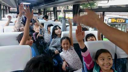 1号車では、補助員の長谷先生に質問コーナーで盛り上がっています。道は順調です。