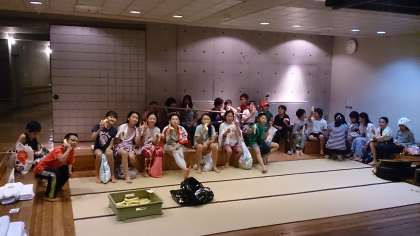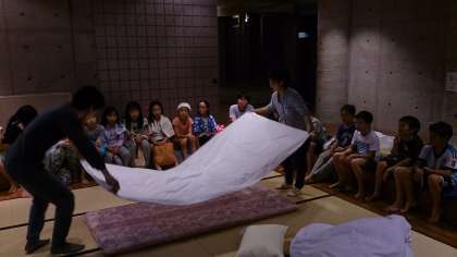 入浴後布団の敷き方を習って、バナナタイムです。ちょっと全体に時間が押してます。がんばれ!