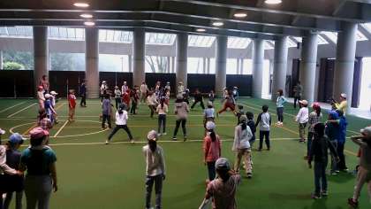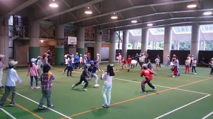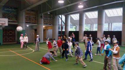 屋根つき広場でスポーツ大会が始まりました。まずは、ヒッチです。クラス対抗で熱い戦いになっています。
