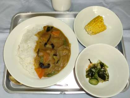 夏野菜のカレーライス 牛乳 わかめサラダ