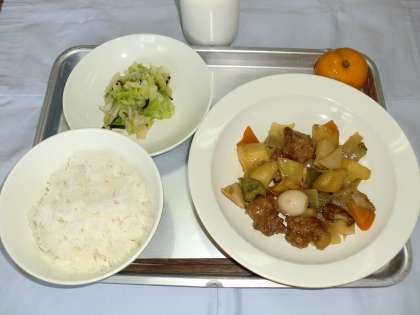 ごはん 牛乳 酢豚 キャベツの塩こんぶかけ