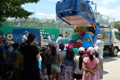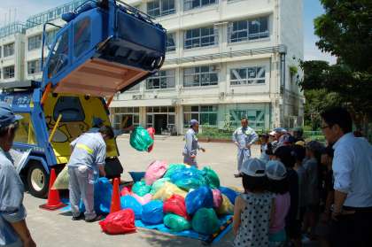カラフルな模擬のごみ袋を車に積み込む作業などを体験しながら、日ごろ家庭から出ているごみの処理をしてくれている人たちの工夫や苦労を考えることができました。