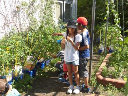 7月11日(月)の児童朝会の後、1年生は生活科の「やさい名人になろう」で取り組んでいるミニトマトの栽培の観察をしました。