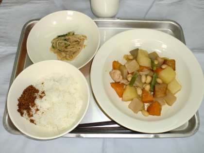 ごはん かつおでんぶ 牛乳 豆入り筑前煮