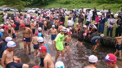 水をせき止めたせせらぎで、アユつかみ本番です。たらいとはちがい、なかなか苦戦しています。