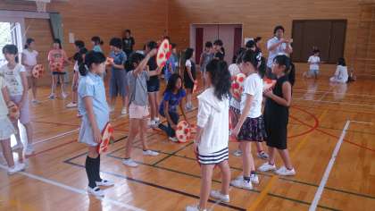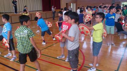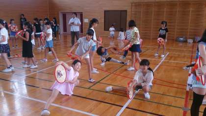 舟形の子どもたちに、花笠音頭の踊りの手ほどきをうけています。