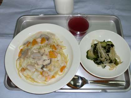 スパゲティークリームソース 牛乳 じゃこサラダ