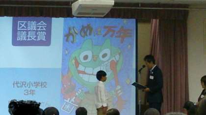 歯と口の健康に関する図画・ポスター展表彰式がありました。世田谷区内から3237点の応募があり、代沢小学校からは二人が、区議会議長賞と審査委員会賞をいただきました。がんばったことが認められて、とてもうれしいです。昔に比べると一人あたりの虫歯の数は1.05本と4分の1に減っているそうです。これからも歯の健康にみんなで気をつけていきましょう。