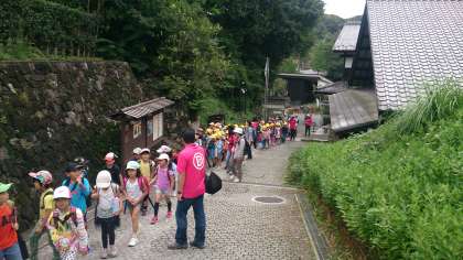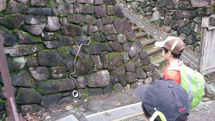 芝生がぬれていて遊べないので、日本民家園に来ました。大きな蛇に遭遇。