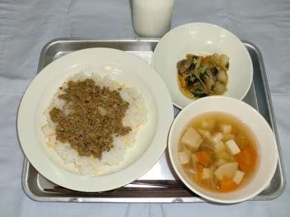 さばそぼろ丼 牛乳 吉野汁 きのこ入り煮びたし