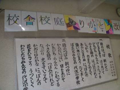 去る6月27日(月)の児童朝会で、代表委員会から「校舎校庭お別れスローガン」についてのお知らせが全校のみんなにありました。それを形にしたものが今、代沢小学校正面玄関のピロティーに掲示してあります。