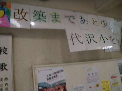 学校にお立ち寄りの際には、正面玄関のピロティーに掲示してあります「校舎校庭お別れスローガン」を観ていただけたらと思います。