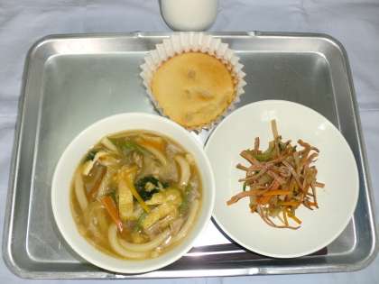 カレーうどん 牛乳 かみかみサラダ りんごケーキ