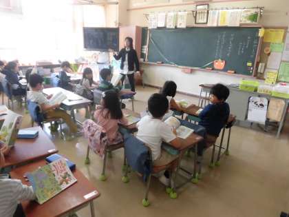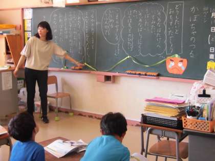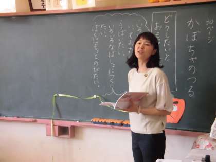 1年生が行った授業の主題名は「わがままを しないで」で、『かぼちゃの つる』という資料を活用して行いました。