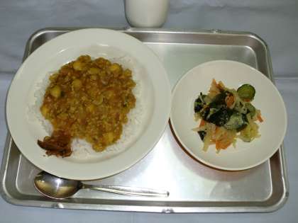 ひよこ豆のカレーライス 牛乳 福神漬 わかめサラダ