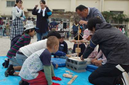 下の写真は、「カレー炊飯」の合間に実施している『火おこし体験』の様子です。