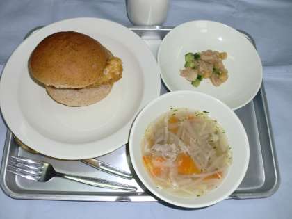 フィッシュサンド 牛乳 ヌードルスープ