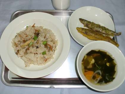 きのこごはん 牛乳 ししゃもの二色揚げ すまし汁