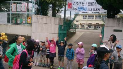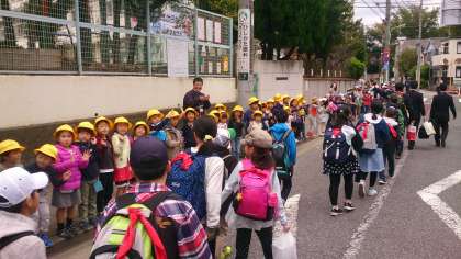歩道に並んで子どもも、大人も最後のお見送りです。
