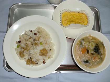 まめまめおこわ 牛乳 千草焼き 切り干しだいこんのみそ汁