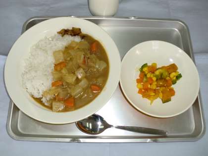 大根カレー 牛乳 福神漬 パンプキンサラダ