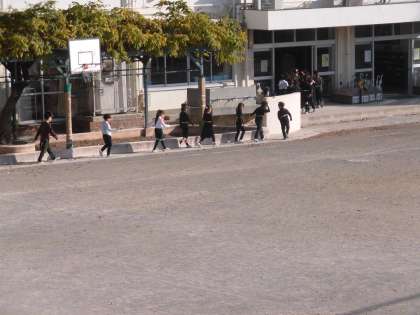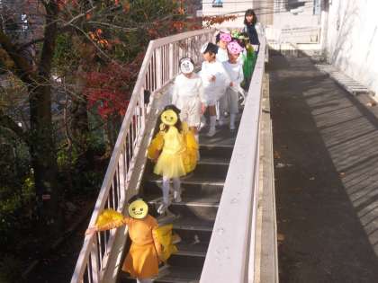 12月2日(金)の「児童館賞日」はその名の通り、劇を演じている学年以外の、5つの学年の児童がお客となり、鑑賞をしました。劇が終わると、体育館の上から見て左回りに移動をしました。つまり演じていた学年は下手(しもて)から退場し、そしてつぎの演目を行う学年は、上手(かみて)から舞台にあがりました。