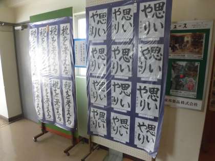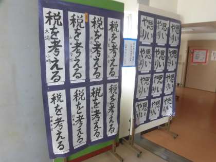 今、体育館前ピロティーにて、「税を考える週間『小学生書道作品展』」に出展した作品を展示しています。
