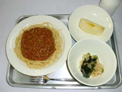 スパゲティーミートソース 牛乳 じゃこサラダ くだもの