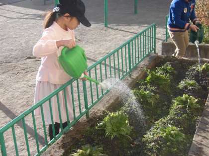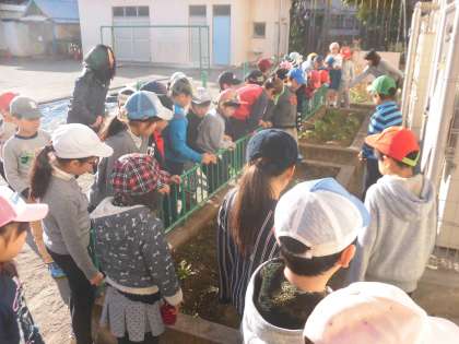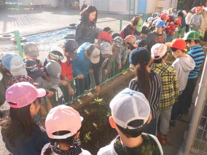 今日は、校舎西側にある花壇で、児童朝会後、冬野菜の観察をしました。