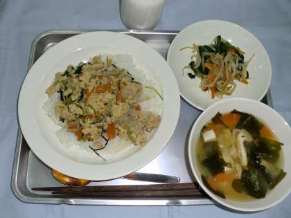 *給食の親子丼は、鶏肉、たまご、たまねぎの他に、