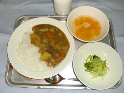 カレーライス 牛乳 ブロッコリーのサラダ フルーツポンチ