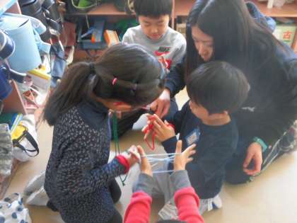 2月20日(月)の2,3時間目、1,2年生は交流学習「昔から伝わる遊びを楽しもう」を行いました。