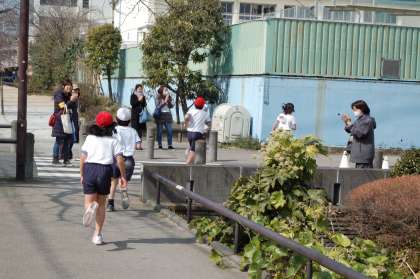 実施場所は、校庭、及び「せせらぎ公園」までの緑道でした。