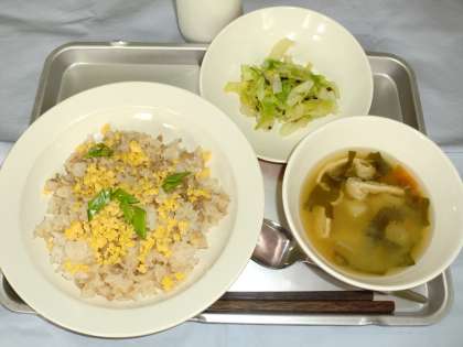 三色丼 牛乳 キャベツの塩こんぶかけ みそ汁