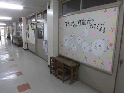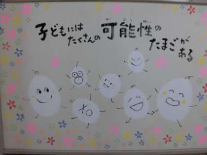 壁面いっぱいに素敵なイラストと、熱いメッセージ『子どもには たくさんの可能性のたまごがある』が描かれています。